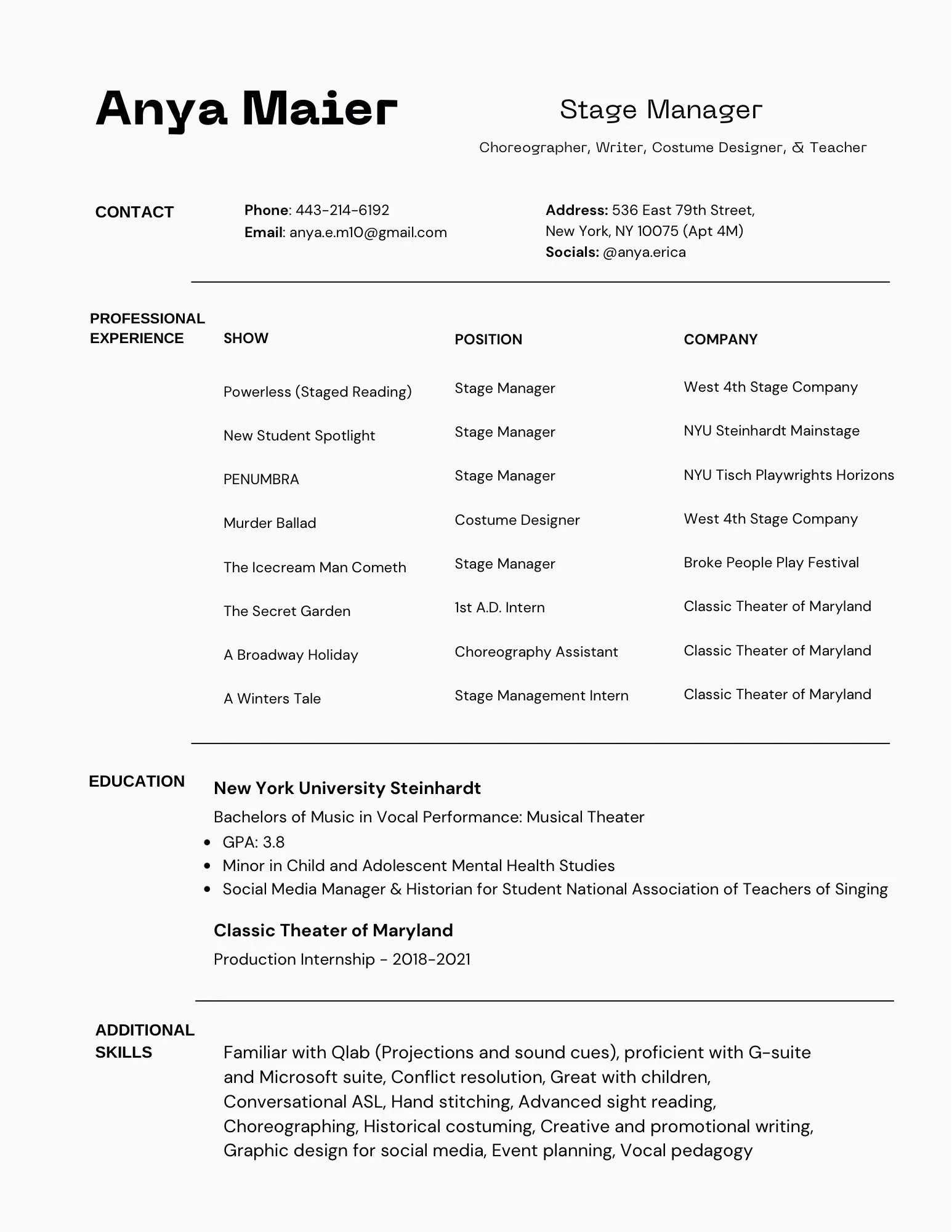 What makes Anya an asset to a production team is her skill in conflict management, memorization, and organized problem solving. Her love for stage management is rooted in her love for both performing and design: she has found that it is a way to watch every piece of a production come together, and help said pieces become cohesive.